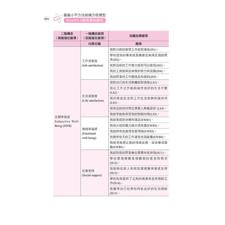 以教師主觀幸福感量表為例,四個共同因子即為潛在變項(構念),其測量指標變項為量表的題項。