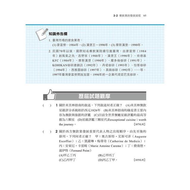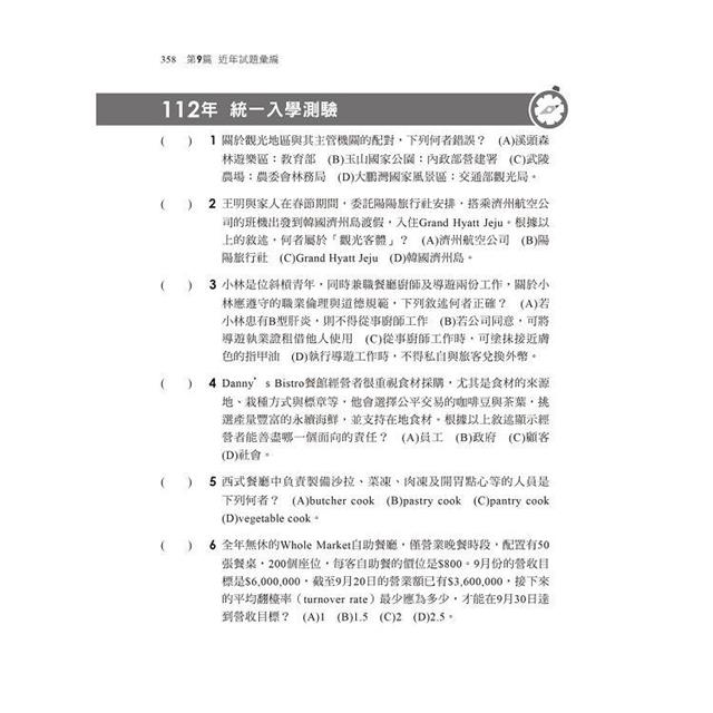 內容編寫主要是據108課綱最新公布考試範圍,配合教育部公布之職業學校餐旅群「觀光餐旅業導論」課程綱要之架構,另外,也參考歷屆試題(含110 年考題),另收錄「觀光概論(含我國現代觀光事業之發展)」、「餐廳與廚房的格局設計」、「餐務管理」、「房務管理、房務相關術語與 房租計價標準」、「旅客入出境及旅行業常用觀光英文術語」⋯⋯等單元,以期掌握完整的命題趨勢。