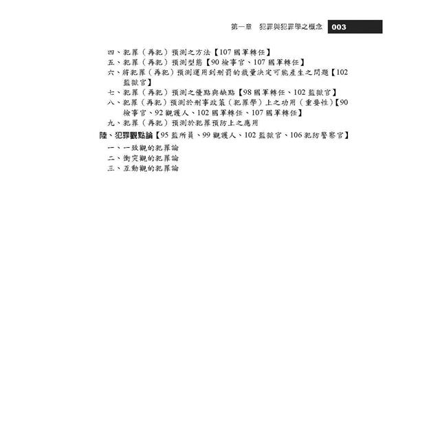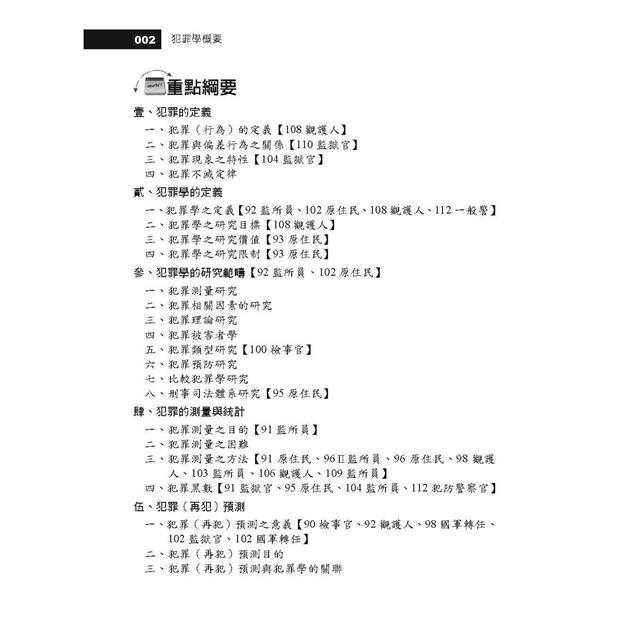 筆者一路從四等考試、三等考試、犯罪防治研究所碩士班、犯罪防治研究所博士班一路考上來,因此我對犯罪學有很深厚的感情,堅持用生命寫出最新、最好的補教用書一直是我的願望,因此每年改版時,筆者總是挑燈夜戰逐一檢視本書內容,除了不愧對同學,也無愧於心。