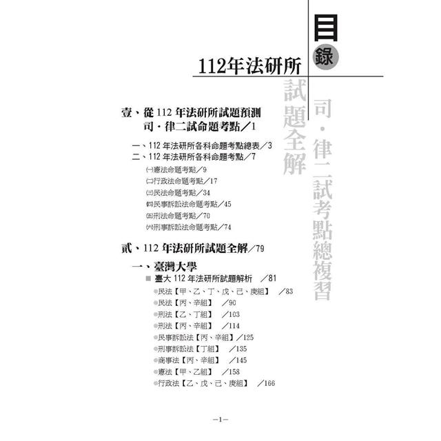 每年年初的法研所考試,都可以視為當年司律考試的前哨戰;司律二試除了實務界工作者出題外,學校教授也是題目來源的一部分。每年都會有大幅度的修法及實務見解的變動,除了大家都熟悉的傳統考點以外,更害怕老師突出奇招,考出獨門暗器,殺個同學措手不及;從法研所的題目就可以窺知教授們近期關注的議題以及教授文章內容,本書收錄了今年法研所的考題,除了附上擬答給各位參考外,也同時提示最新的考點,附上相關參考文獻及實務見解,提供考生能更進一步探討。透過研究所考題「鑑往知來」,除了能知道最新的熱門考點以外,更提供練習題目的機會,並且能預測最新考試方向。