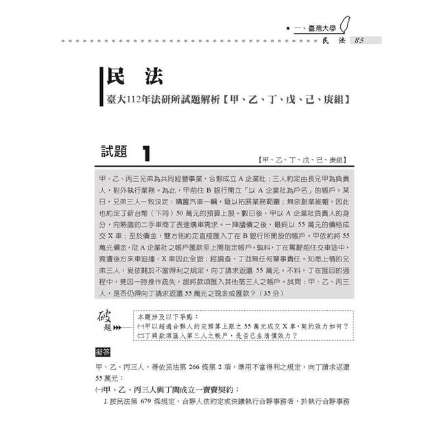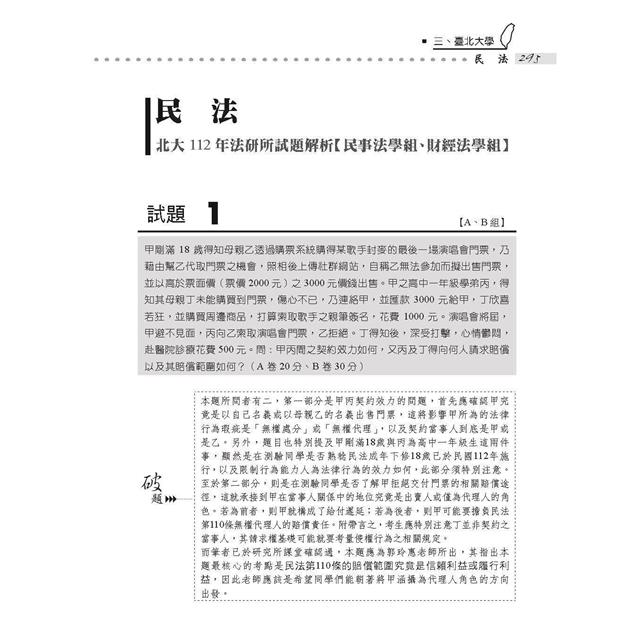 很多人準備法研所考試,是為了讓自己在國考之前能夠有動力念書,順便檢測自己有沒有念懂,簡單來說就是練筆(XD)。不過練筆的意義是,「準備好了」去寫寫看,而不是什麼都沒準備就上場打仗。但老師的文章這麼多,如果以國考為重心,花太多時間看文章可能本末倒置,因此,考古題就顯得相當重要!本書是一個掌握各校不同老師出題方向的工具書,各位準研究生可以透過本書因應各校老師的獨門暗器,省去大量閱讀文章的時間,同時也增進自己論述能力,在考場上才不會發生看懂題目卻寫不出來的窘境。舉例而言,台大商法組的公司法出題老師多為曾宛如老師,可以透過考古題了解近期老師針對哪方面有研究,再針對該部分加深,比起漫無目標的閱覽,更能提高效率。總而言之,法研所的考試,除了掌握實務見解外,學說見解更是拿分關鍵,並提出考生自己的論點,相信看完本書,一定能夠學會很多答題技巧,本書將會成為你上榜的助力!