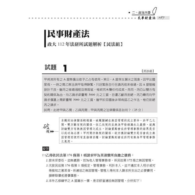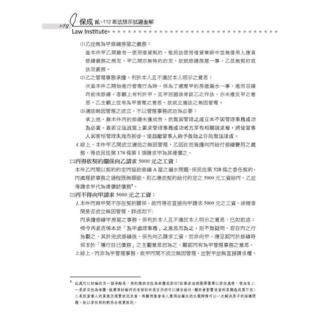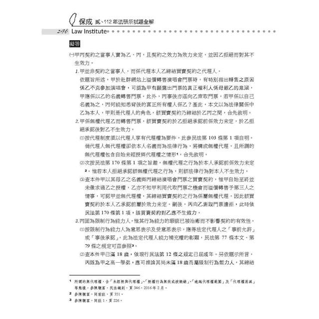 大家切記在準備考試使用解題書的過程中,請勿在看完題目後直接看參考擬答,這樣就失去練習題目的意義了!本書的使用方法應該是:先不要事先看題目,模擬真正的考試狀態,在設定的考試時間內,親自動筆練習,寫好寫滿,寫完之後比對參考擬答,審視自己的錯誤,並加強自己不足的地方;最後可以閱讀參考文獻,看教授的文章除了能了解學說見解以外,其實透過老師文字的脈絡,對邏輯跟思考的層次都有幫助,對於論述的實力必然大大提升!