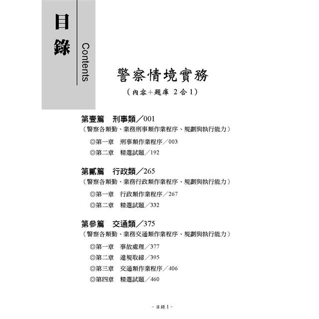 先從今年的考試題型分析,三等考試今年是一題刑案現場處置算是基本題型、一題酒測處置(酒測已經連續兩年出題)難度也不高,一題是防治類的跟蹤騷擾防治法,如果沒有特別準備可能會有突襲的疑慮,所幸今年筆者在題庫班上特別強調本法。而四等考試相對性較為基本,勤查、交通與失蹤人口,神奇的是沒有考出刑案現場,大多是基本閱讀熟練即可。情境實務一直以來都不是一個很好準備的科目,屬於綜合性很強的科目,要具備很熟練的警察相關法規(如毒品、家暴、警察職權行使法、刑事訴訟法等),還要了解勤務運作、還要知悉執法倫理以及很細微的實務函釋。很多人以為(包含學校老師)只要待在派出所這一科必定是很容易準備,其實不然,因為不是所有的派出所員警都處理過全部的案件類型,即便有處理過案件類型,但不一定符合警政署的函釋要求,而這應該就是學理與實務的落差。所以情境在研讀尚須先將法規予以熟讀,再仔細閱讀處理要件與應注意事項,而非是事前事中的流程的思考,方能夠全面,像今年三等的刑案現場就是一個例子。這兩年警政上將出現重大變革,勤務勤休時間將要配合釋字785號做一調整,希望能真正重視基層員警之健康權。今年本書改版除了配合警政署修正新的SOP之外,也增加一些與本科高度相關的法條,例如跟蹤騷擾防治法等(本法屬於重要警察法規,未來應該會有越來越多的案件出現。)