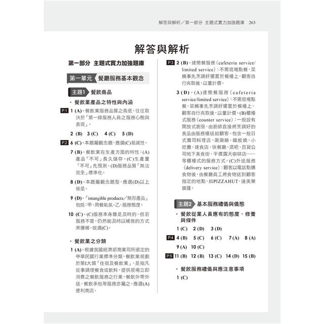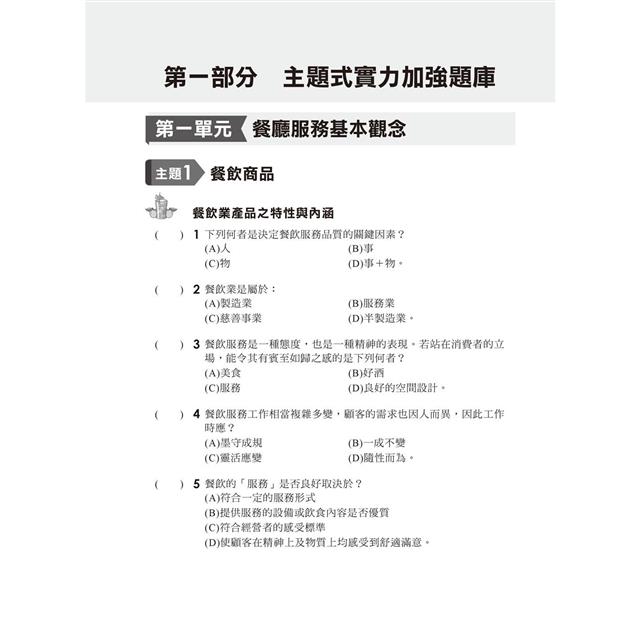 第一部分為主題式實力加強題庫,針對「餐飲服務」一科,根據108課綱考試範圍,針對精華試題,編列經典範題及解析。盼透過各類重點考題、題庫之匯整與逐題解析,可以從題目之演練中,熟知考試趨向與題型;並於經典範題及解析之後,更進一步針對各類考試重點,提供變化題、延伸題、綜合題型等之進階試題演練,以藉由淺而深的試題演練與解析,得收融會貫通、打通任督二脈之效。