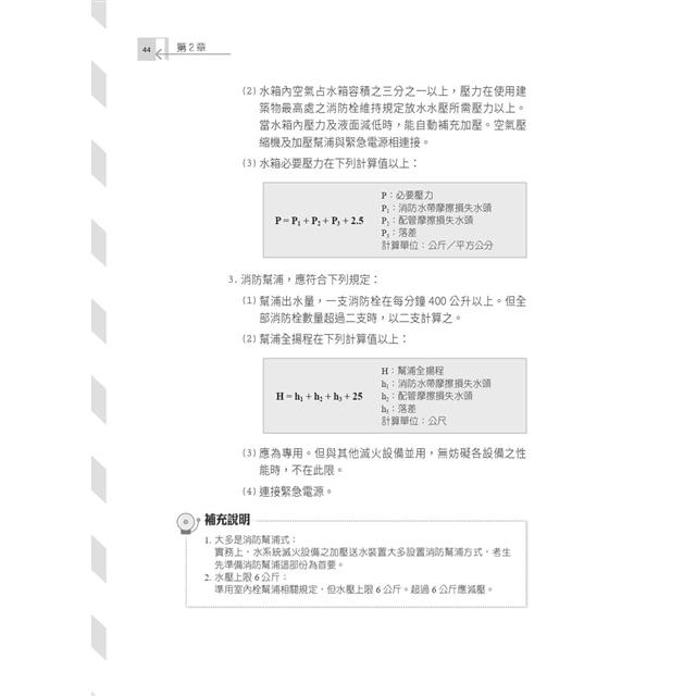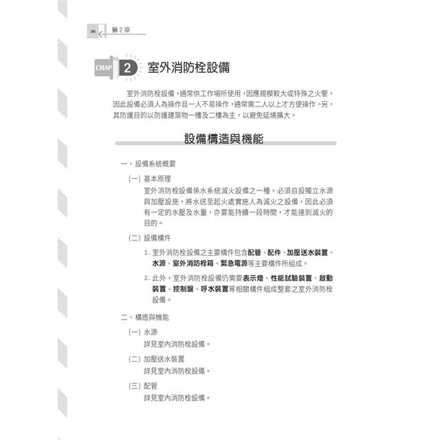 本書以「各類場所消防安全設備設置標準」及「消防安全設備及必要檢修項目檢修基準」之最新法規為主軸,並根據考選部公告之「專門職業及技術人員普通考試消防設備士考試各應試科目命題大綱」中的〈水與化學系統消防安全設備概要〉科目命題大綱所撰寫,全書架構如下: