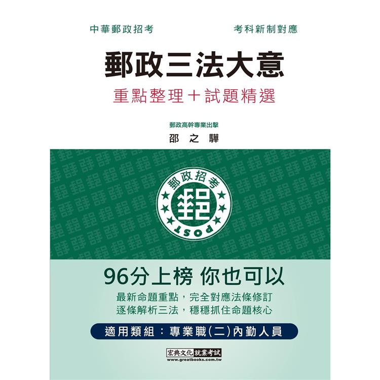 因應《郵政法》最新修訂條文正式施行,另《郵件處理規則》亦經歷重大修訂→此部份無疑將是未來考試絕對必考要點。為此宏典編輯部特與郵政法規作者「郵政高幹邵之驊」攜手將郵政內外勤法規內容「全書修訂」,讓您讀到「真正會考的重點」,贏在起跑點。