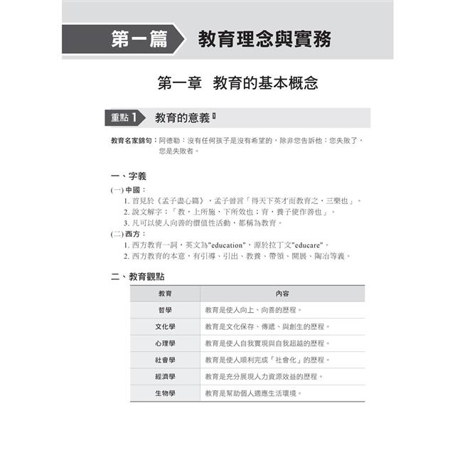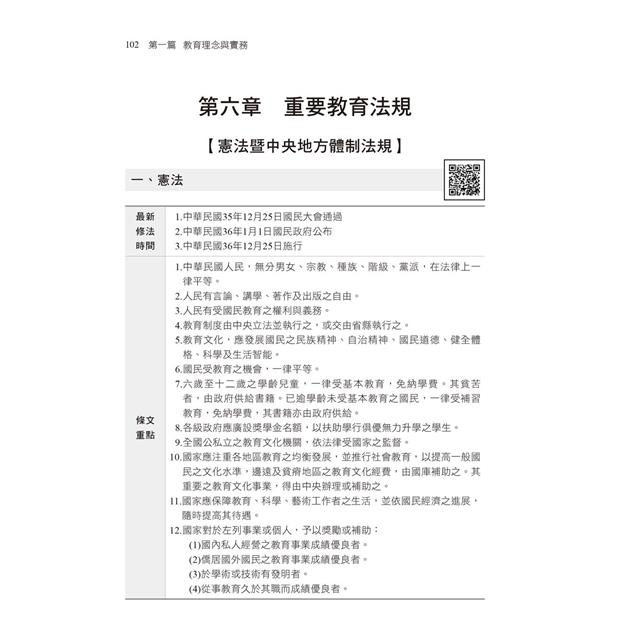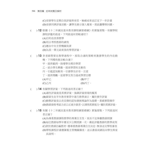 本書第四篇近年試題及解析,收錄了109~112之近年試題,並做命題分析,讓你更能掌握命題方向。準備教資考試的應考要訣有以下兩步驟:第一步就是,從歷屆考題中吸取重要概念,加以熟練;其次,讀通、讀透本書,即可獲致高分通過的應考實力,此為第二步。