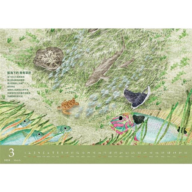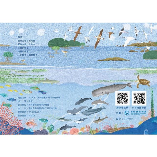2024年海洋保育桌曆以「海的棲家」為主題,透過插畫美術,汲取臺灣多元海岸地形、棲地環境為故事場景,邀請多樣且令人目眩神迷海洋生物逐月同台演出,開啟大眾對海洋更多的知識基礎,與更無邊無際的創意想像力,也讓人充滿了好奇與想像。