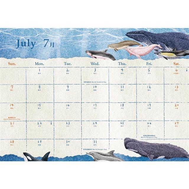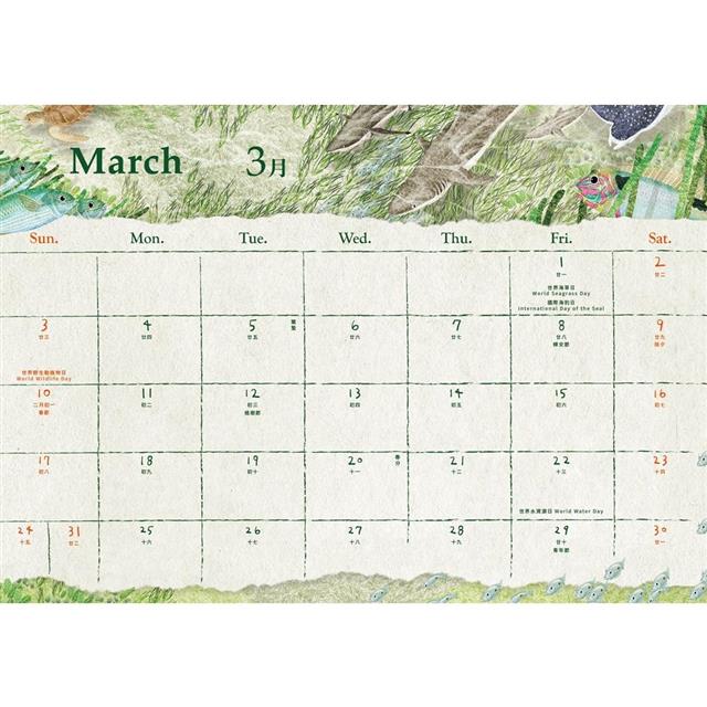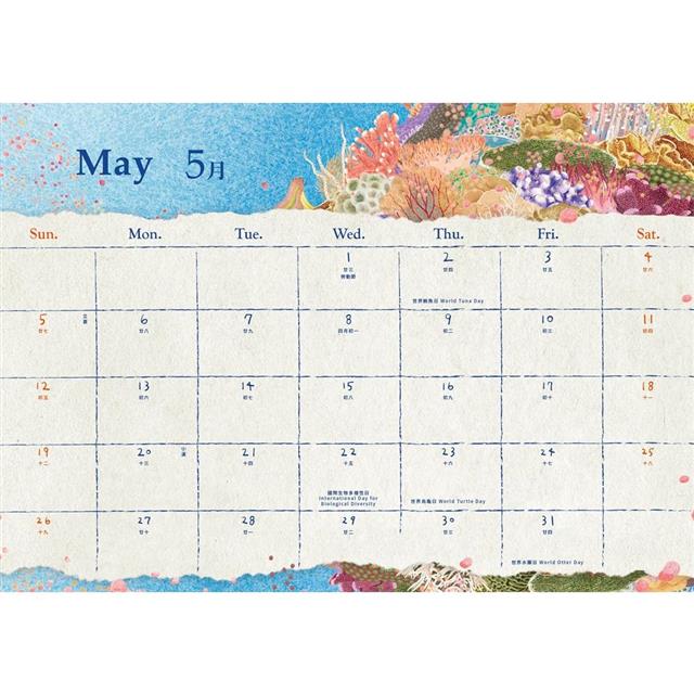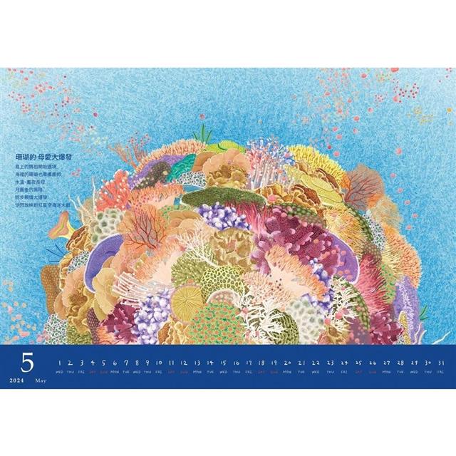 從一月開始,帶領大眾從陸地出發,如紅樹林、泥灘地、潮間帶…,一路由淺而深的望向海洋;也有切合時序如5月的珊瑚產卵奇觀,以及多樣生態中的互利共生與偽裝擬態行為等…。讓海洋保育月曆成為人們牆上一幅美麗的畫,也不時提醒著熱愛海洋的我們,走出戶外親近海洋、也關心我們的海洋,以及以海洋為棲家的一切生物。