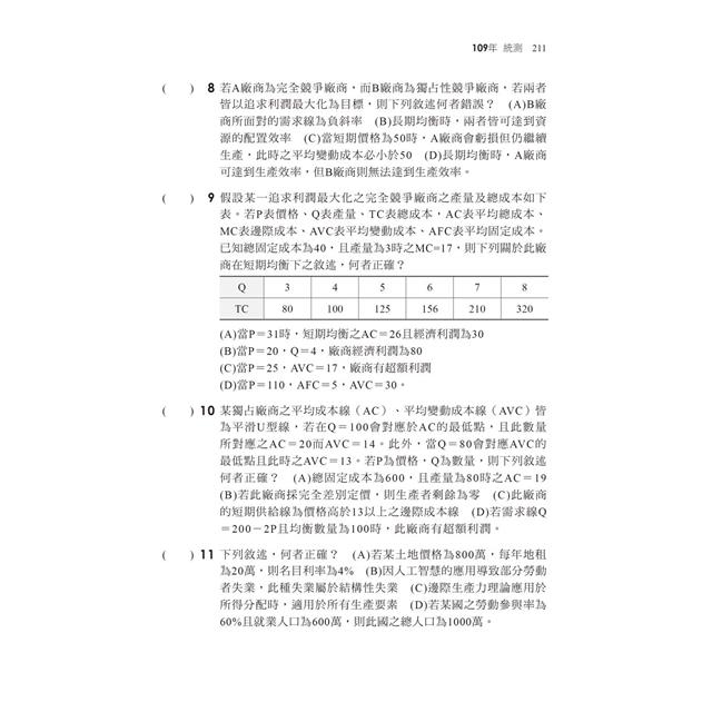 根據108課綱編寫,統一入學測驗考試科目「經濟學」這一科,由於範圍廣泛,準備起來實有不知從何下手之感,坊間一般教材編寫雖然詳盡,但厚重的上下兩冊,在時間有限的情況下要複習完也非易事,因此,挑一本整理清楚且有系統的複習用教材是不錯的選擇,例如:千華數位文化所出版的升科大、四技系列《經濟學完全攻略》。但僅有重點整理的教材還是不夠的,必須要瞭解考試的題型與方向才能克盡其功,尤其是在課綱變動下,考題趨勢更為重要,因此這本《經濟學歷年試題+模擬考》是完全針對想在短時間內獲取高分的人所編寫的複習教材。