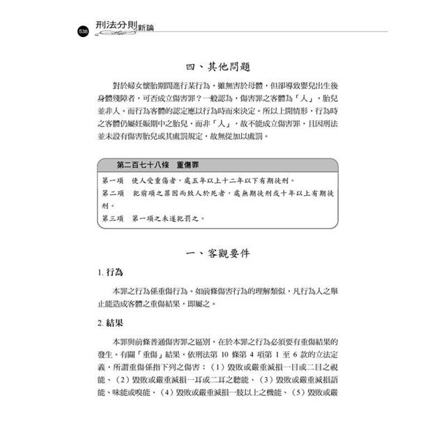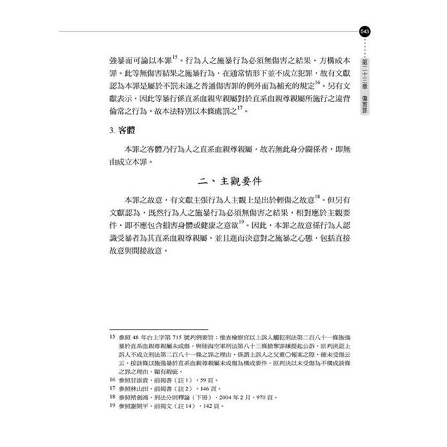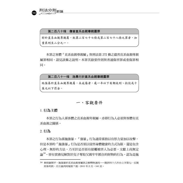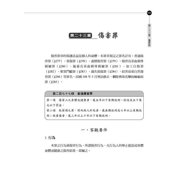 本書針對刑法分則各個罪章中所規定的罪名逐條加以闡釋,以整合我國文獻見解的方式,並融合重要的實務見解,進行有系統的論述。使讀者得以一窺刑法分則的全貌,並且了解各條文罪名在實務上的適用情形。