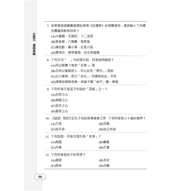 針對報考國小教師甄試的考生,本部分精心統整了九大主題,包括「字形測驗」、「字音測驗」、「字義測驗」、「成語與題辭」、「國學常識」、「文法及修辭」、「書信格式用語」、「文字學」、「聲韻學」,每個主題皆搭配相關練習題,讓考生準備時有方向可以遵循,面對看似浩瀚無邊的國語文考題不再茫然無助!