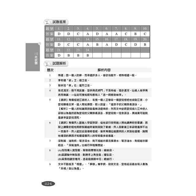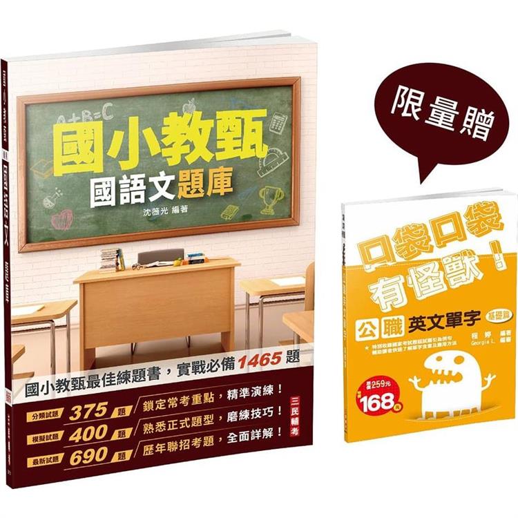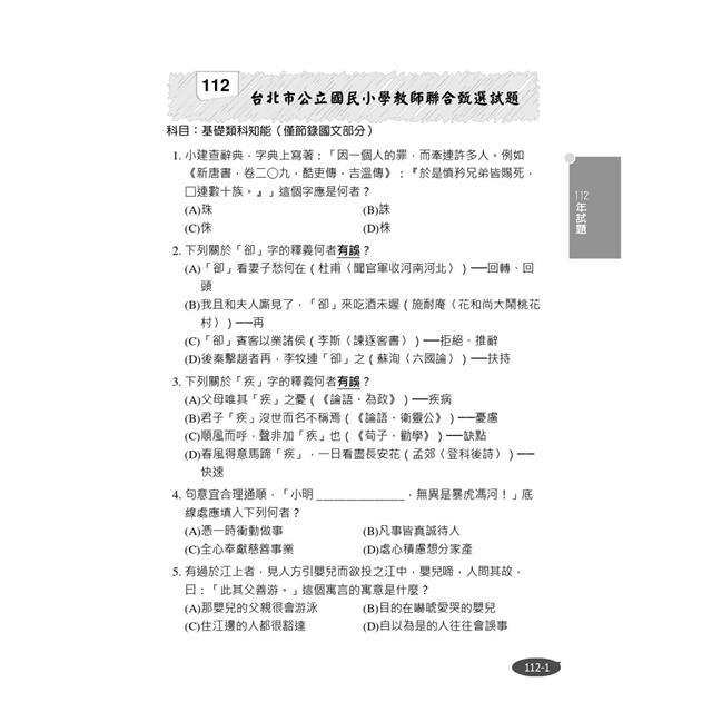 本部分收錄108年~112年台北市、中區聯盟、台南市、高雄市(110年因疫情影響僅有台北市有招考)國小教師甄試國語文考科試題共17份,總計690題,讓考生鑑往知來,掌握國小教師甄試國語文命題方向!所有試題皆附詳盡解析,文言文的題幹文章並提供白話語譯,勤做試題演練,必能在應考時繳出漂亮的成績單!