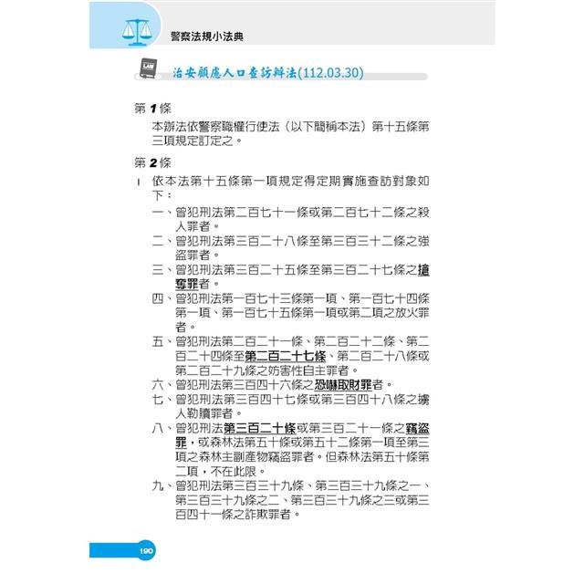 這本《警察法規小法典》適用於一般警察人員四等(行政警察)考試、警察人員特考(警察特考)三、四等考試、警察人員升官等考試。