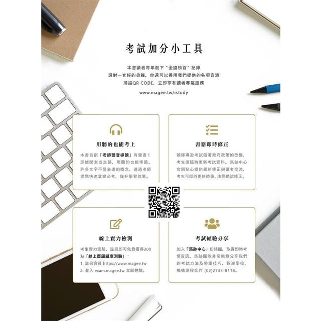 ※本書加值:讀者享免費線上考題測驗,隨測隨算成績,考試落點分析