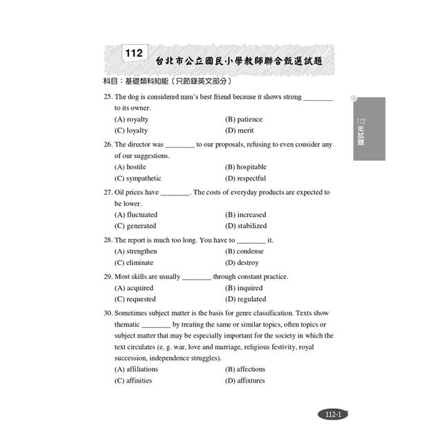 本部分收錄108年~112年台北市、桃園市、中區聯盟、台南市、高雄市國小教甄英文科試題(109年高雄市未招考專業類科英文,110年因疫情影響僅有台北市有招考)共20份,總計700題。讓考生鑑往知來,掌握英文考情趨勢!所有試題皆附詳盡解析,勤做試題演練,必能深植應考實力!