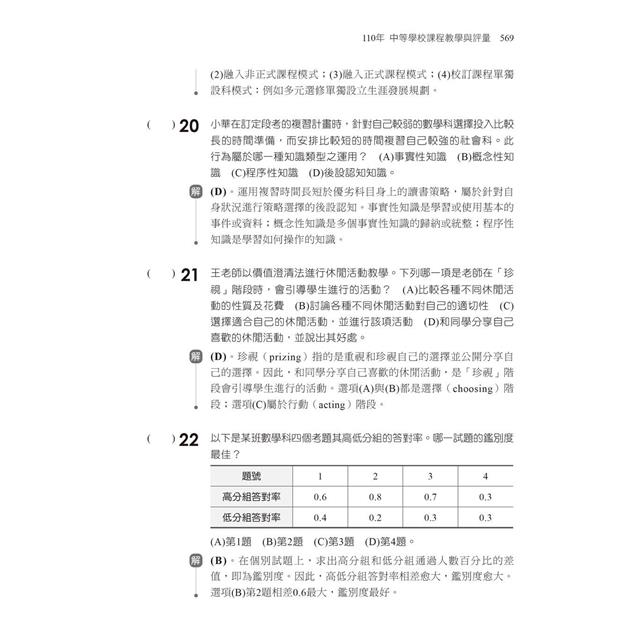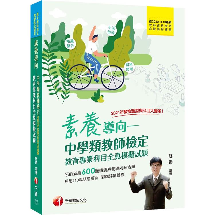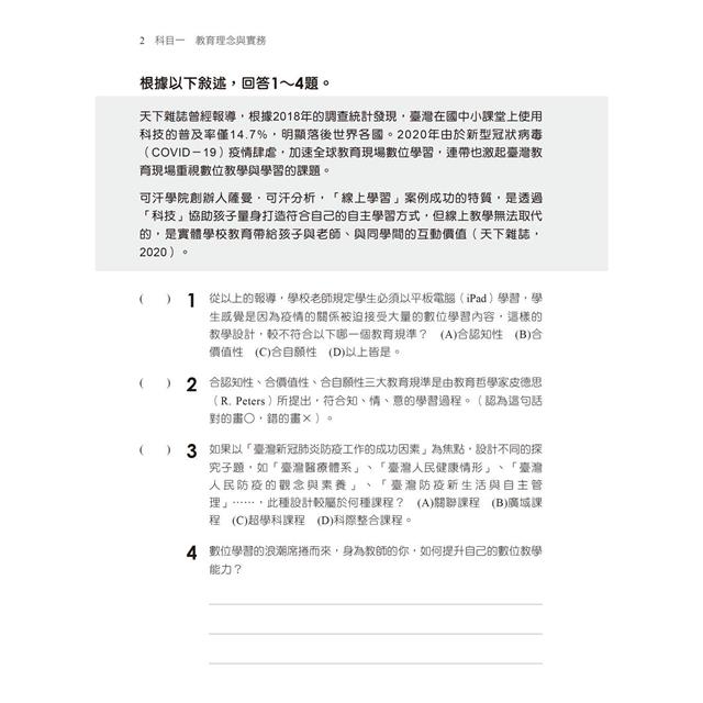 因為素養導向試題強調生活情境、跨科跨域、知識整合,舒老師參考過去考題重點與「情境素養導向綜合題」的命題原則,精編600題精華模擬試題,題目不再分章節陳列,也不再以題型歸類安排,而是將所有題型打破建制、綜合組成一份模擬試題。為了訓練答題速度,模擬試題以40題為一回,考試時間一樣80分鐘,份量要比過去歷屆教檢更多更重,「加重訓練才能輕盈快跑」。而且所有「重要的考點」都放進題目中。所以,勤練加上有技巧地閱讀與答題,就能輕鬆敲開教檢/教甄大門。