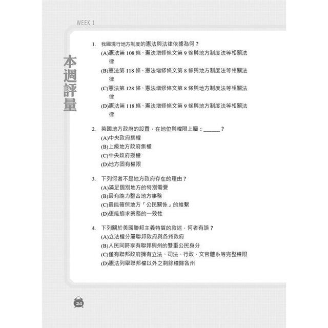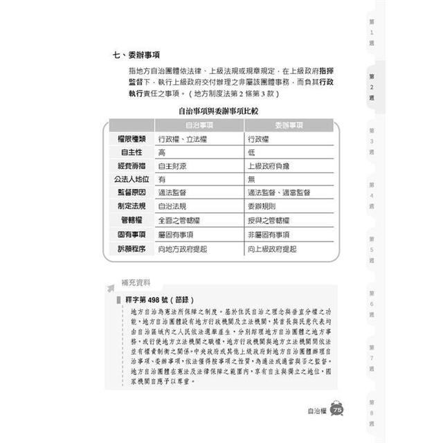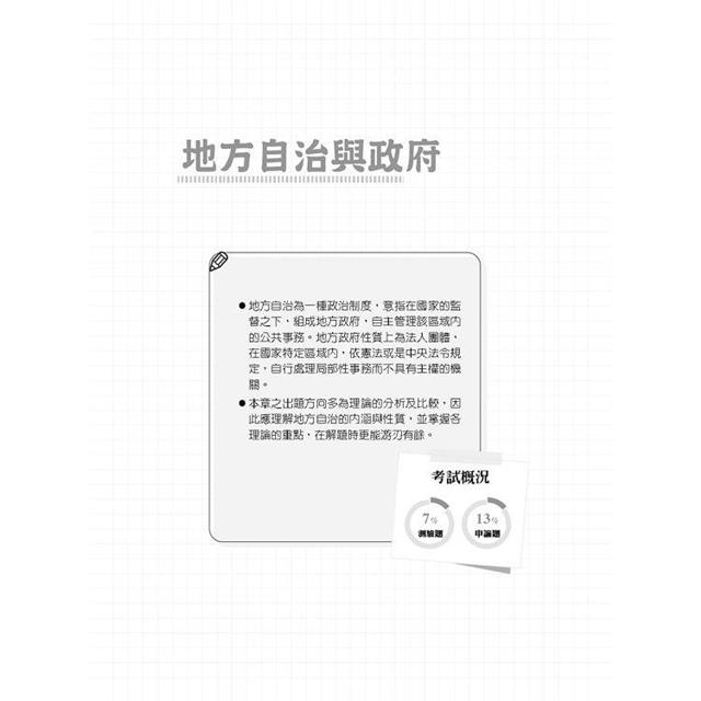 地方自治的命題範圍既深且廣,許多考生在準備上常抓不到方向。以申論題為例,除傳統考點外,因應全球化趨勢,地方自治發展方向今非昔比,不單是依靠第一部門之指揮監督,更講求公部門、私部門及第三部門彼此間協商與合作管理區域內自治事項之公共事務,使治理的概念擴大化,相關認知的重要性亦隨之上升;而以測驗題為例,除基本理論或學說外,與之有關的大法官解釋也常出現在命題中。為幫助考生在短時間內攻克本科目,本社特聘三民補習班名師精心為考生彙整關鍵考點,除了讓考生「讀這本就夠」之外,更進一步先幫考生將書中內容安排成八週進度,讓考生能夠循序漸進準備。