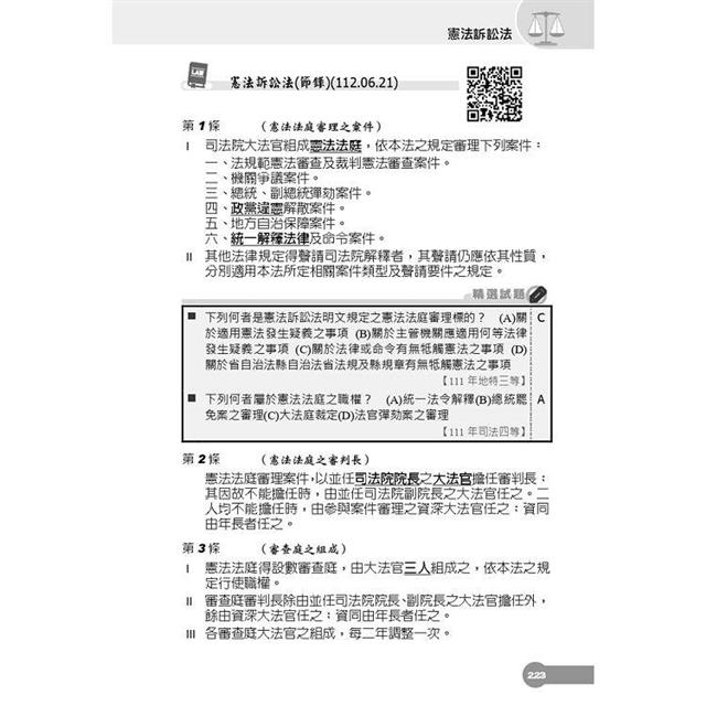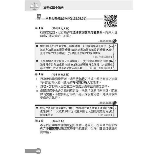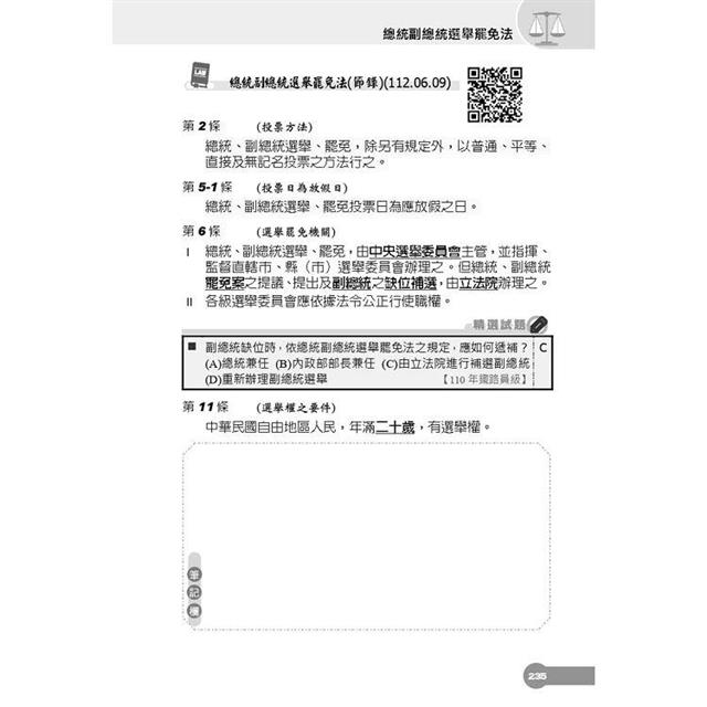 本書精心設計,讓法典除了是查詢法條的工具書外,更結合豐富題庫與重點標示,絕對比坊間小六法更實用。背完條文即可演練題目,掌握歷年出題脈絡,突破修法要點。上考場嫌書太多太重太累的話,帶這本讓你神清氣爽,俐落地將考場的零碎時間化為涓涓入袋的分數。
