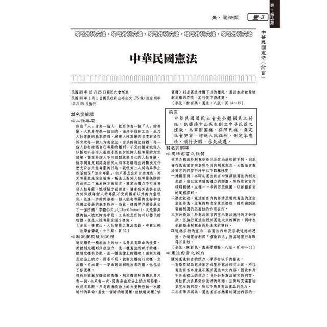 十一、大法官解釋:本書收錄大法官解釋解釋爭點、解釋文全文,並精心設計大法官解釋體系表。係以法典出發,或與坊間論著略有不同,僅供讀者參考。