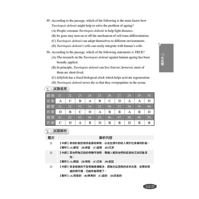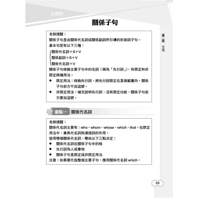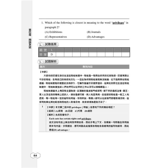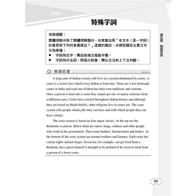本部分共分為「字彙」、「文法」、「克漏字測驗」及「閱讀測驗」四篇。再依各自的命題重點,分為十餘個主題,每個主題前皆置重點說明,幫助考生掌握考科重點,每篇後另附該篇實力演練,讓你每學習一個單元就能立即驗收成果,不僅練習作答技巧,更是考前重點複習精華!