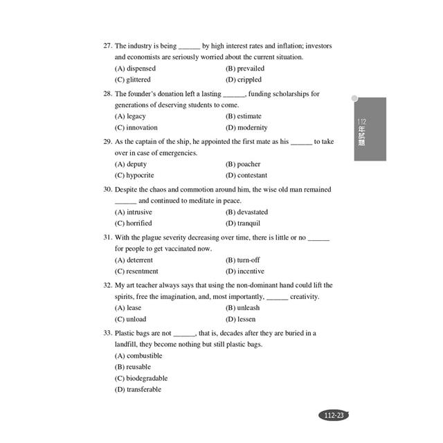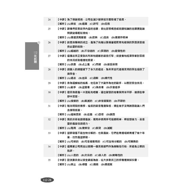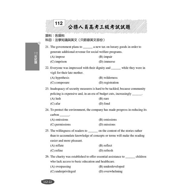 本部分收錄104~112年高考、普考及各項公職三四等考試英文科試題共44份,讓考生鑑往知來,掌握英文考情趨勢。所有試題皆附詳盡解析,透過勤做試題演練,必能深植應考實力!