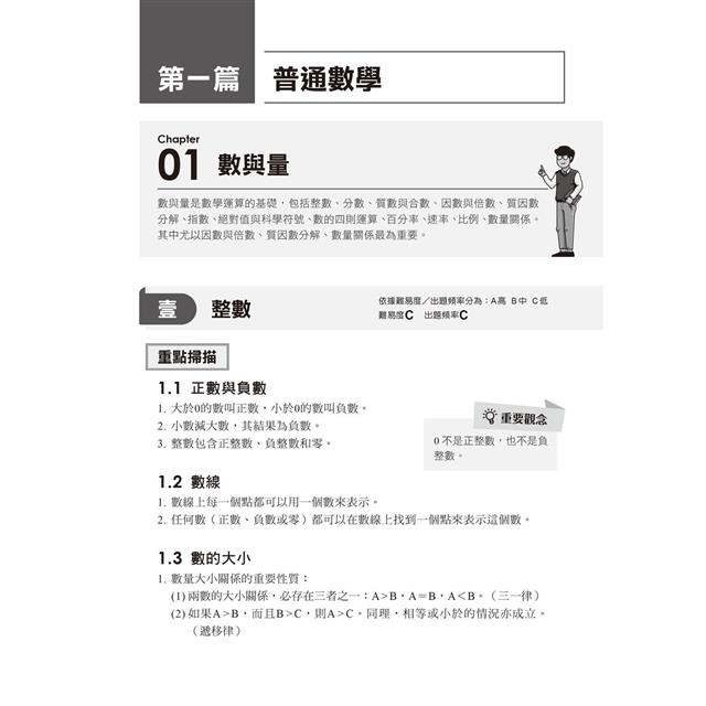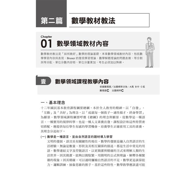 因此,內容部分採全方位設計編寫,兼顧數理科系學生的加深加廣,以及非數理科系學生可以重頭學起且紮穩實力。為此,配合考題趨勢分成第一篇「普通數學」與第二篇「數學教材教法」兩部分,每一單元輔以重點掃描與精選範例,讓各位熟悉各單元考題類型與概念,章末並編入大量考題練習,讓大家通古貫今,熟能生巧。