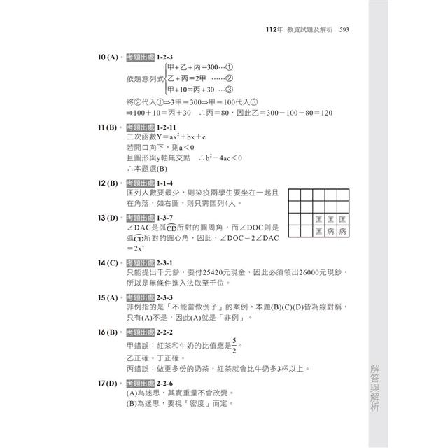 然而,教師資格考的修訂一向是改版時最為重視的區塊。筆者於本次新版內容中特別針對新增的「綜合題」題型,先在試題分析與準備之道內容中介紹「素養導向試題的準備方法」,再於內文「素養導向綜合題型範例練習與答題妙招」專篇討論。只要了解出題原則,並熟悉解題關鍵,要正確答題應無難處。