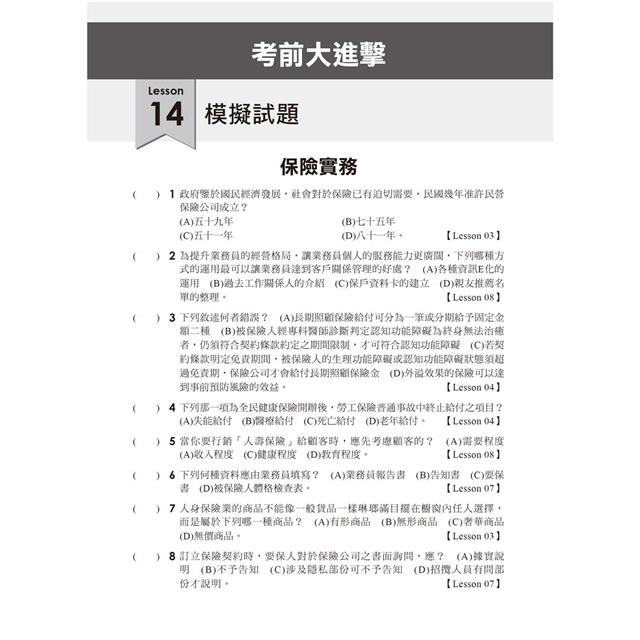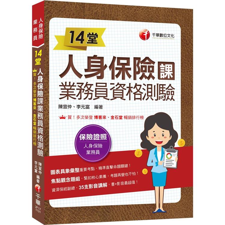 除了拼命死背題庫外,你有更好的選擇!千華數位文化所出版的《14堂人身保險業務員資格測驗課》全書系統化的區分課文重點,並將所有考試題目循序漸進的分作小試身手和實戰演練以及全範圍模擬試題,不僅讓你有階段性(由小到大)的目標複習,更有實務經驗的名師為你精心編錄大範圍仿真模擬試題,並針對較易混淆的難題加以解析,相信不僅能幫助你順利獲取證照,更能幫助未來踏入保險業的你理解更多的實務操作,比別人提早做好準備!