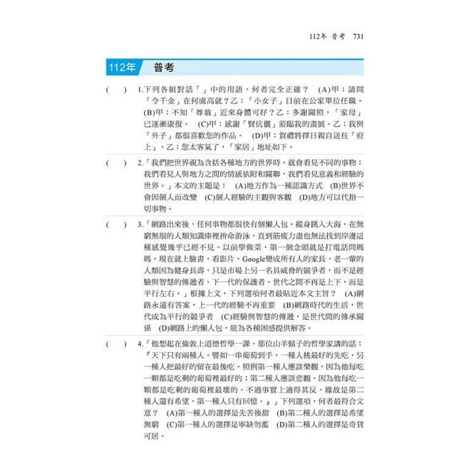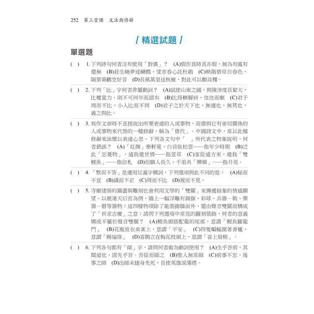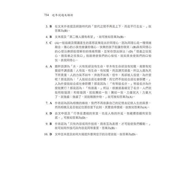 觀察出題走向,可以注意到近年特別加強了文意的閱讀部分。韻文的部分則多以閱測題組的方式呈現,隨讀隨測,可增加記憶,達到儲備戰力的目的。而在散文方面,鑑於古文閱讀題型的大量增加,為了讓考生能更精準的掌握文字的內涵,不再以節錄式的方式編排,而是提供全文的閱讀。而我們除了必要的注釋來幫助考生了解內文,同時也概括性的說明主旨、介紹作者,並舉出每篇中重要的文句進一步闡述,最後並附上題目作為實力評量之用。