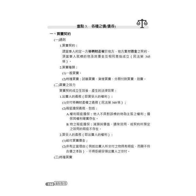2.故為應對此種常識性考法,「民事法律」的概念最為重要。其原因不外乎是,民法為國民普遍交易最常接觸之法律,身為將來要成為公務人員一份子的考生,也將會有面對民眾的需求,故以民法來建構基本法學素養是學好這科的不二法門,若考試準備時間有限的話,不妨先行閱讀本書詳盡、清楚的民法、民事訴訟法整理,而後再準備其他法律。