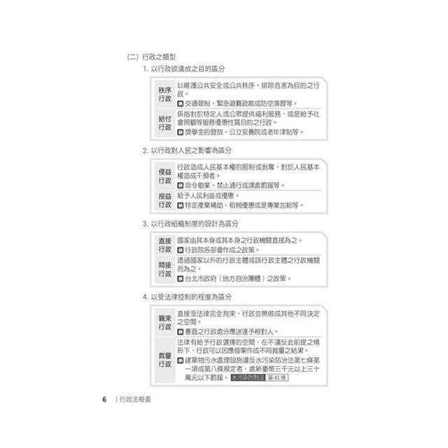 「行政法」並非一部法律,而係泛指一切與國家行政相關之法律,與公行政有關之法規範皆乃行政法之範疇。然而,行政法規範了行政權的組織、作用、程序以及救濟等,主要包含「行政組織法、行政作用法、行政救濟法」三大範疇。其抽象的概念;廣大且難以精準掌握的範圍,時常讓考生頭疼。