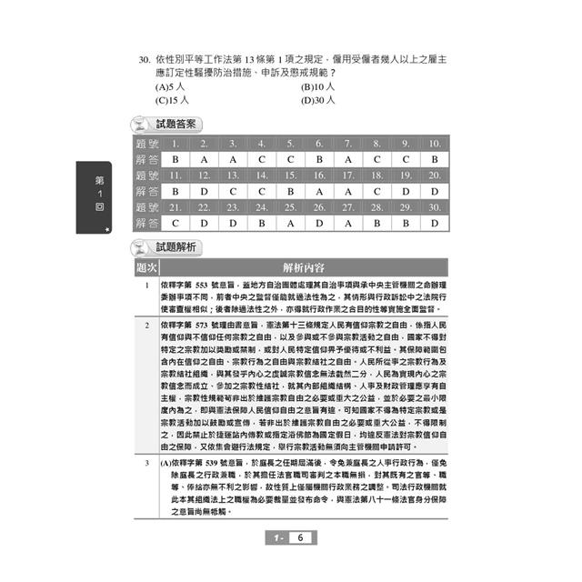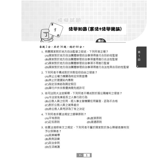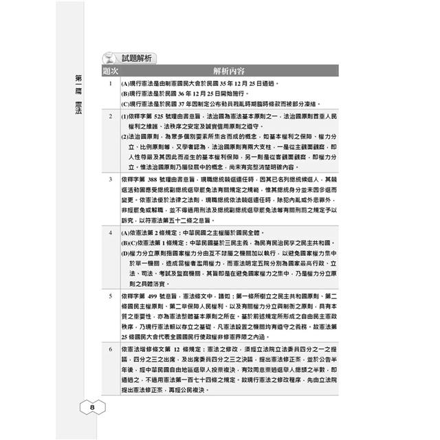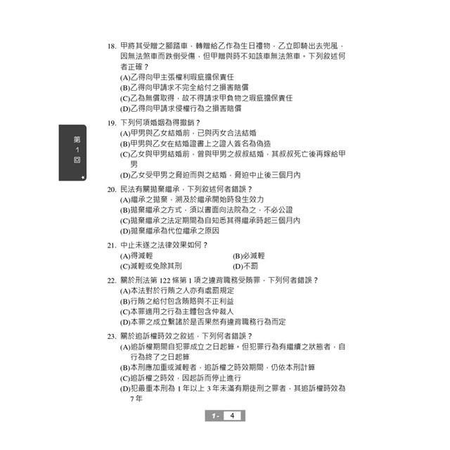 第三部分最新試題詳解:收錄111~112年高考三級、普考、警察人員三、四等、鐵路高員三級、鐵路員級、司法人員三、四等、地方特考三、四等試題共16份,100%題題詳解,將理論陷阱與細節一一揭露。過去的考古題往往成為來年命題委員出題的基本素材,要想掌握本科考情趨勢,務必勤加演練!
