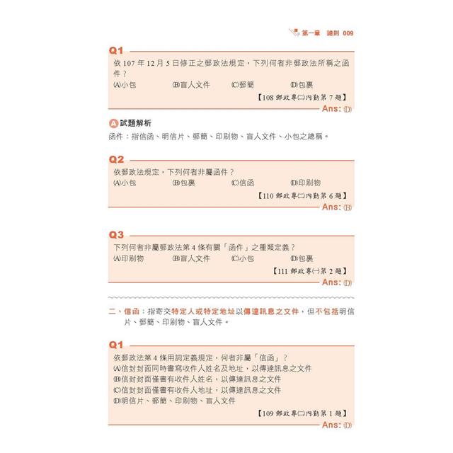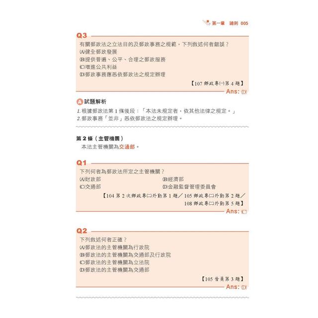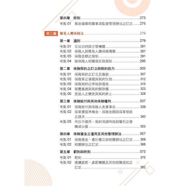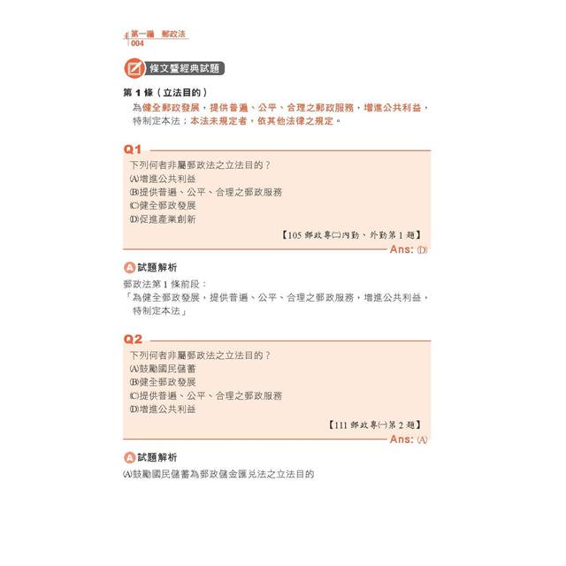 藉由大數據歸納整理出歷屆試題,精準分析出題方向,並將歷屆試題「由淺而深」循序漸進地呈現給本書的讀者,搭配「題題詳解」,使讀者能夠在最省力且最有系統的狀態之下,掌握郵政法三法(郵政法、郵政儲金匯兌法、簡易人壽保險法)測驗題的得分要領。