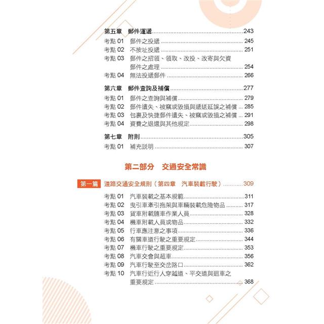 透過關鍵字句的學習以及題題詳解的實力養成,協助讀者針對「郵政法規大意及交通安全常識」達到「點」、「線」、「面」的學習,不僅能夠在測驗題獲取高分,更能夠進一步實現申論題作答的實力養成,幫助讀者在國家考試當中金榜題名。