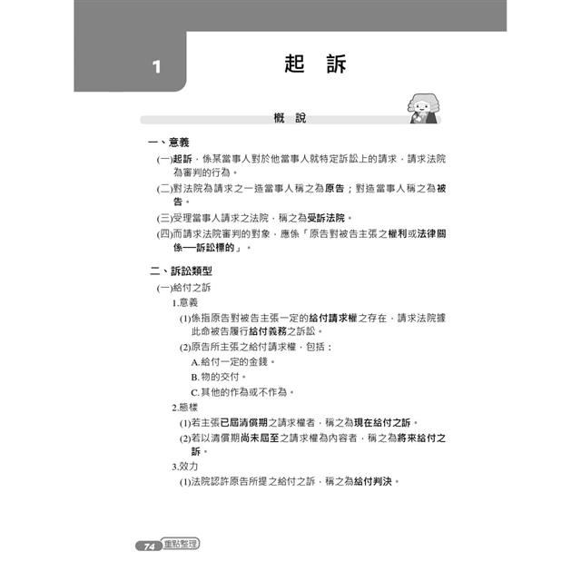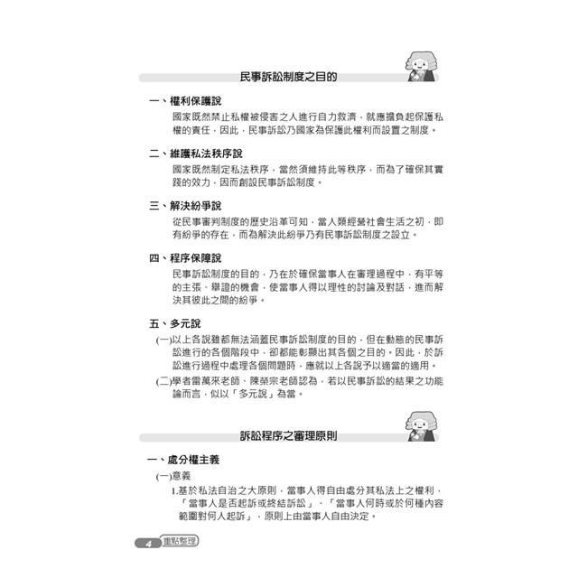 3.關於民事訴訟法之備考也須注意各家學說、重要實務見解與法律座談會意旨,書中將其精簡濃縮,讓讀者把有限的記憶力花在刀口上,快速判斷具有命題實益之爭點。