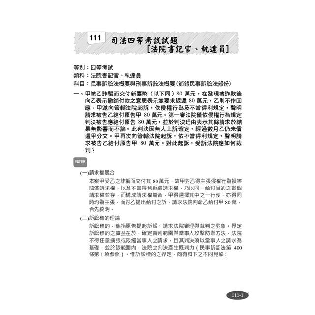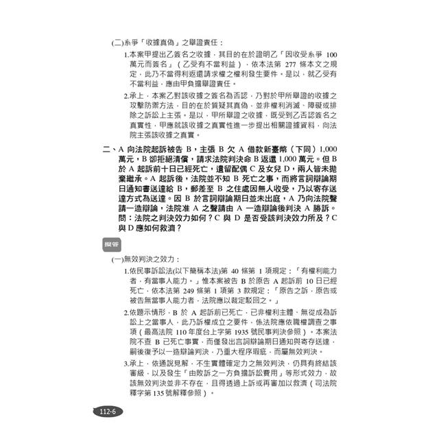 1.近年來民事訴訟法概要題目,除集中於民事訴訟既判力、上訴審與舉證責任等傳統爭議外,關於無效判決之實務處理也成為考試熱點。故熟悉最高法院見解,以判決的書寫邏輯增進法律論述能力,並精要法科考試解題篇幅,為順利考試之不二法門。