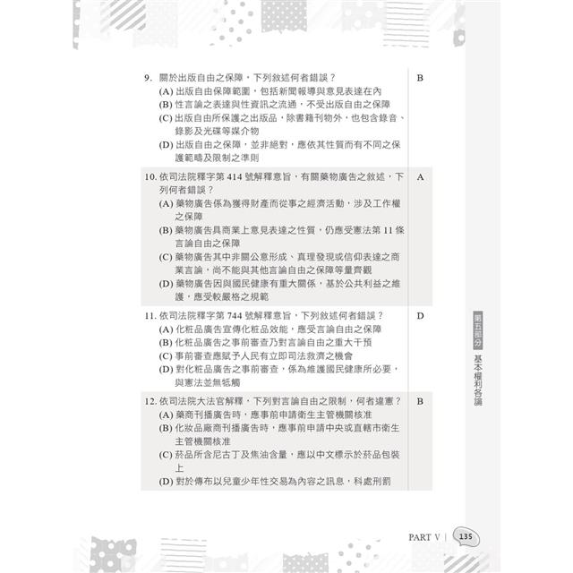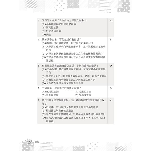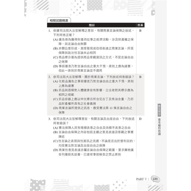 本書於各單元後附有精選試題,均取材自歷來各大考試之憲法試題,建議讀者在攻讀完每單元之後練習考古題。考古題之練習,必須反覆查考、力求精實。在練習之後,再把不熟悉的試題選出,並再回頭至相關單元複習一次、找出尚不熟練的關鍵點、重行攻略之,才是奪榜的不二法門。