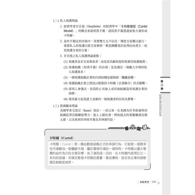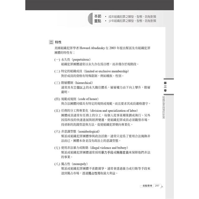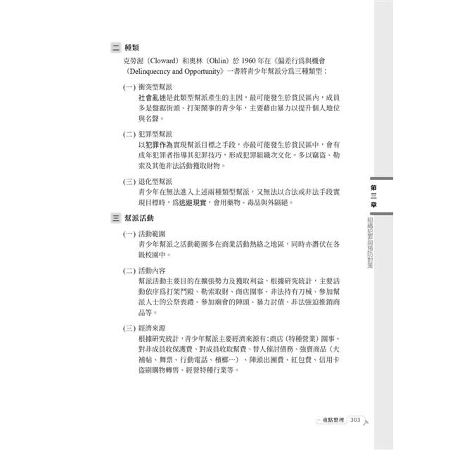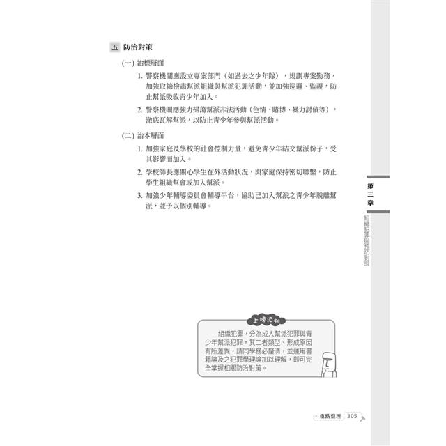 本書先以犯罪學基本概念出發,引導熟悉相關重要名詞及基礎觀念後,再進入犯罪學理論命題重點。使用淺顯易懂的文字,教你釐清各家理論要義及差異。其後針對不同的犯罪類型,細說其發生原因、特徵,指引思考,最後總結出犯罪預防對策。縱使沒有相關學科基礎,研讀此書就能輕鬆駕馭本科目,必能掌握考試致勝關鍵!