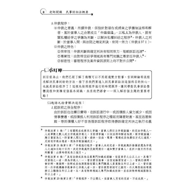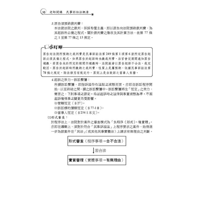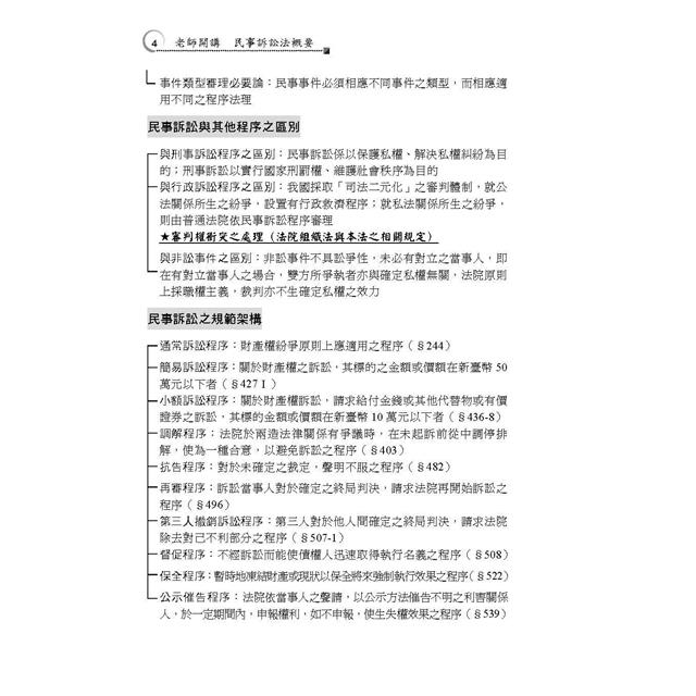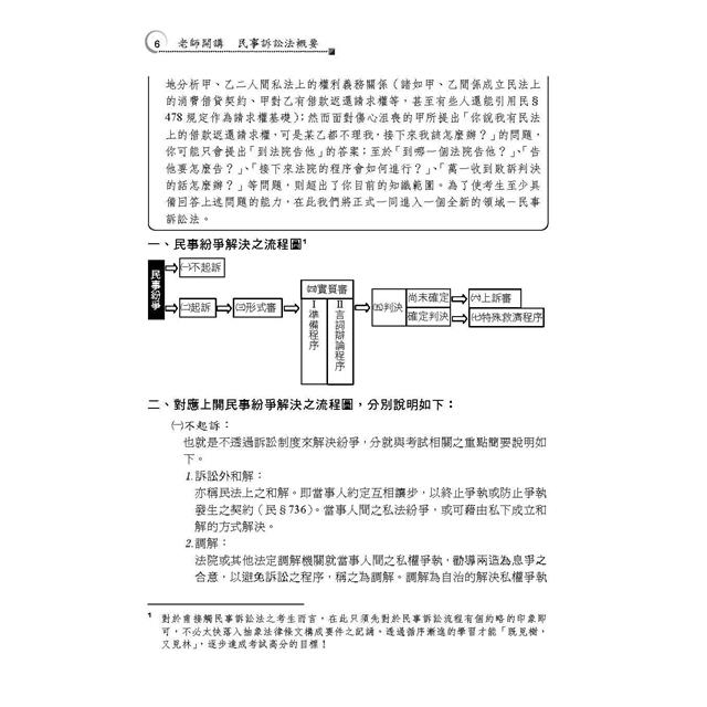 此外,民事訴訟法實務色彩特別濃厚,實務見解亦屢次出現於題目中,重要之判例、司法院解釋之見解,本書均已於內文中提出並說明。此外,曾經成為民事訴訟法題目考點之其他相關法律如民法、家事事件法、鄉鎮市調解條例、強制執行法等規定,本書亦於適當處作說明,以求滴水不漏,大幅節省考生自行搜集資料所需花費的時間。