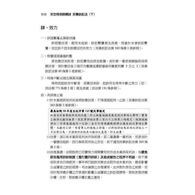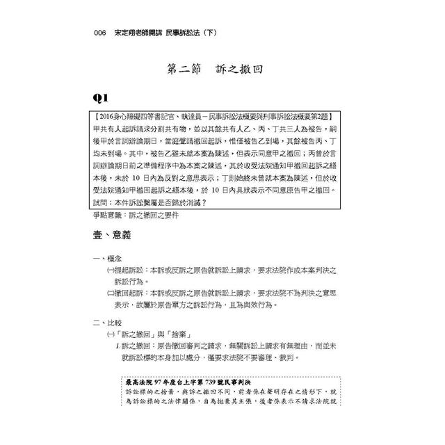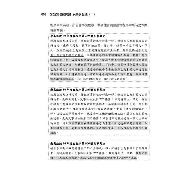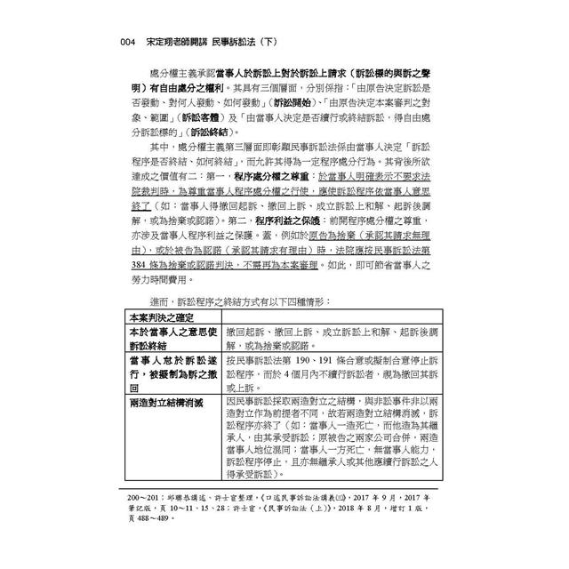 另一方面,雖然本書撰寫內容是精粹教科書、實務裁判與學說文章而成,但是為了加深加廣各位讀者對於民事訴訟法的理解,建議讀者在看完本書,要去看看我在註腳裡引用到的學者文章,第一手吸收各位教授的論述功力。如果有任何理解上需要討論的地方,還望讀者再來與我當面討論,感謝感謝!