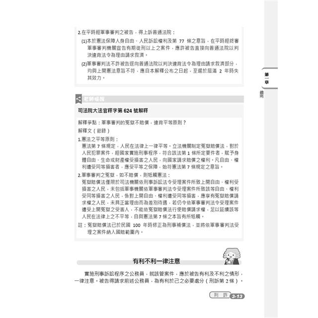 本書特別因應112年施行的國民法官法,將訴訟程序與規定整理成圖表,方便考生閱讀;另外新增與刑事訴訟法相關的憲法法庭判決,使讀者能夠掌握最新見解。