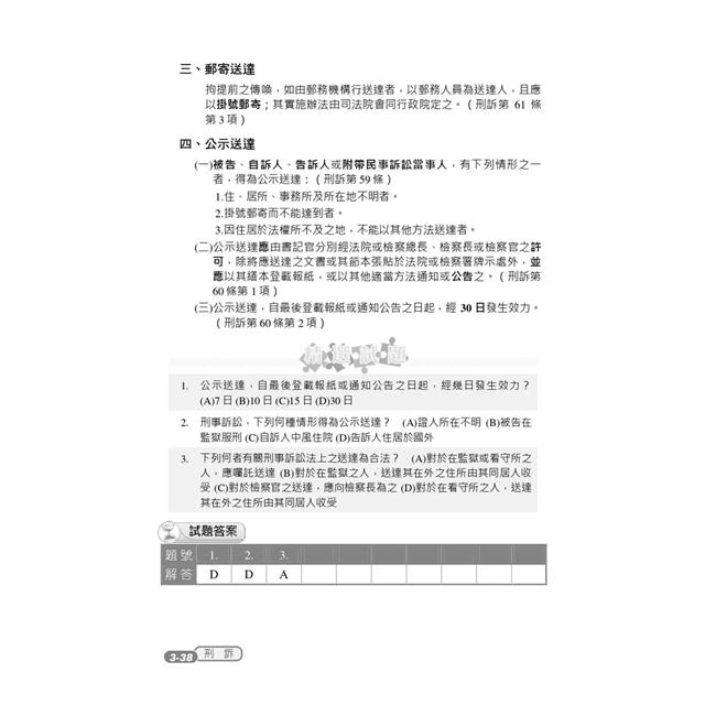 「民事與刑事訴訟法大意」一科出題範圍廣泛,民事與刑事訴訟法加上家事事件法,法條合計逾千條,條文繁複冗長,且新修法內容常為命題關鍵,如何準確掌握最新資訊,常令一般考生感到困擾。