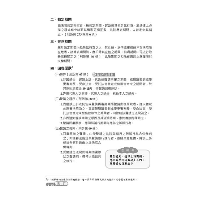 新修法就像是考場上一支出奇不意的勁旅,是命題委員慣用來突襲考生的奇兵。因此誰能掌握新修法,誰就能掌握未來命題趨勢。本書依家事事件法及刑事訴訟法及國民法官法112年最新公布條文修訂,而民事訴訟法與民事訴訟法施行法也提供已三讀通過之新舊條文對照,此書在手,司特五等的命題趨勢已盡在諸君掌握之中。