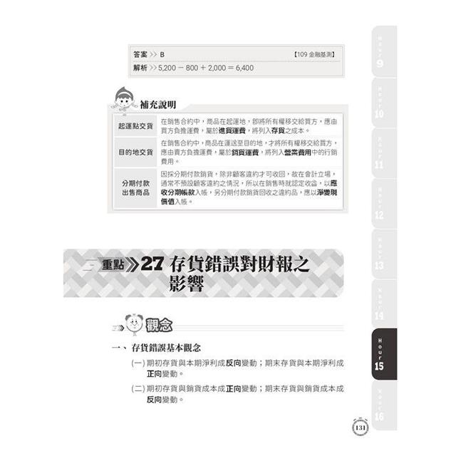 hour 1~hour 40每1小時進度結束後,收錄有與重點相應的「試題練習」,是由作者自近年各大銀行的甄試考題中,精挑篩選而成,幫助考生即時檢測學習效果,以及了解需要再加強之處。