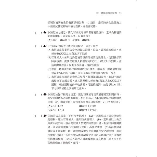 「精挑細選測驗題」近期消防設備師士歷屆考畢試題一一選集,適合章節分別歸類標示考試年度及級別,有些題目除提示解答的要領與關鍵,甚至細說端詳;故而做做測驗題也是蠻有挑戰性,記住要上榜測驗題分數至少拿40分以上。