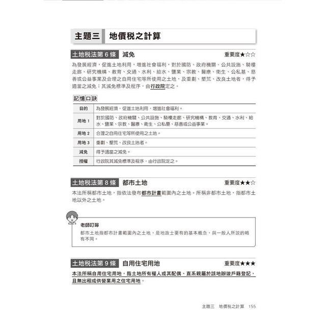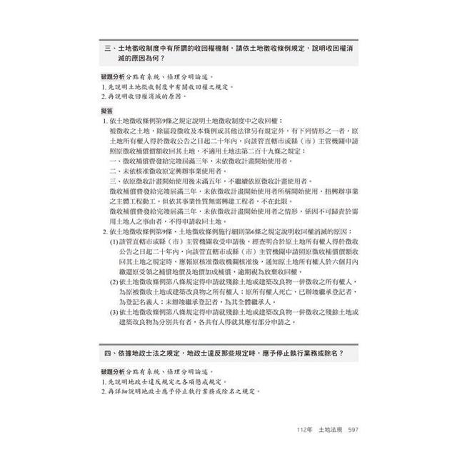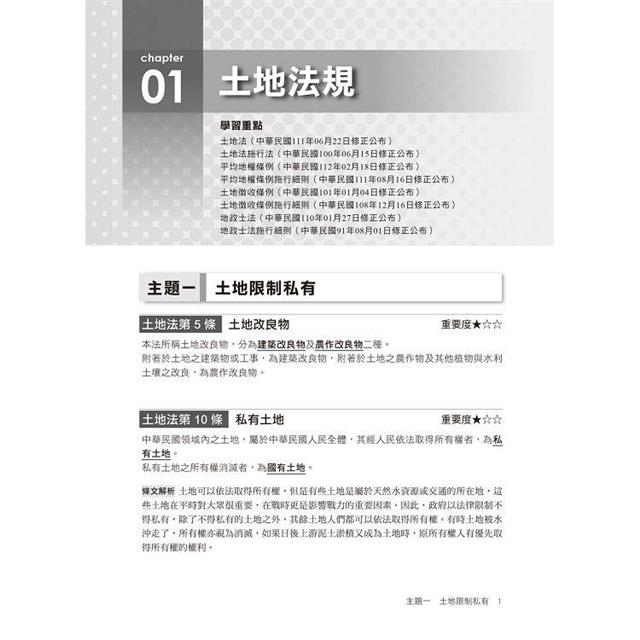 另外,地政士考試需要對法規分熟悉,而法規多又龐雜,常常讓人抓不到重點來記憶,因此作者不僅精心針對重要考試條文作解釋外,同時將繁雜的條文內容編寫成系統化的內容,加上「條文解析」,幫助你快速理解記憶,並用「老師叮嚀」特別需要注意的事項,依照內容編排進行閱讀,留意時事,相信高分上榜並非難事!