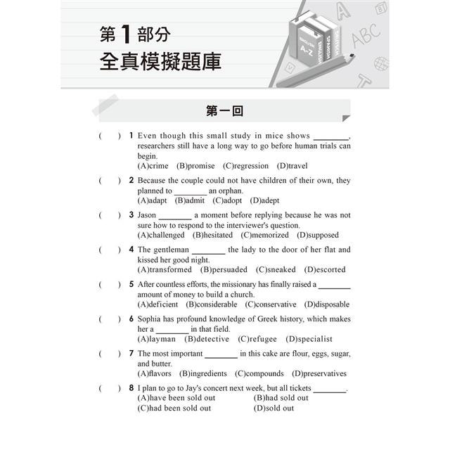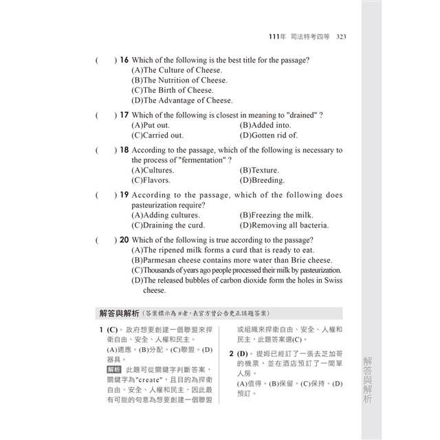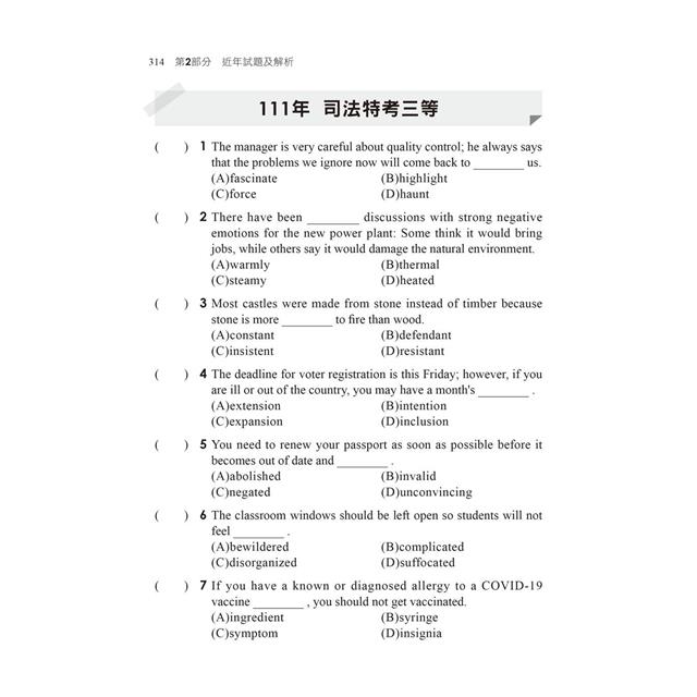 實際的演練是各類考試的勝負關鍵,本書在書末特別整理了近年最新試題,藉由實際的大範圍考題,可自我檢視學習成效。建議可先利用模擬題庫加強弱點,再來練習歷屆試題,寫過後再對答案,錯誤的題目亦可先自行思考,若真的沒辦法再參考解析,針對弱點加強複習。如此才能有效地完成自我複習、精進的考試目標,非常適合考前衝刺使用。