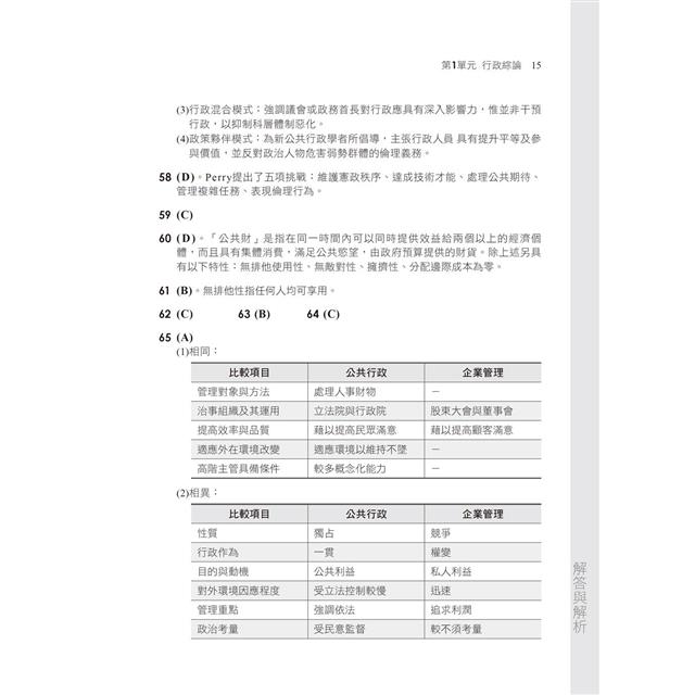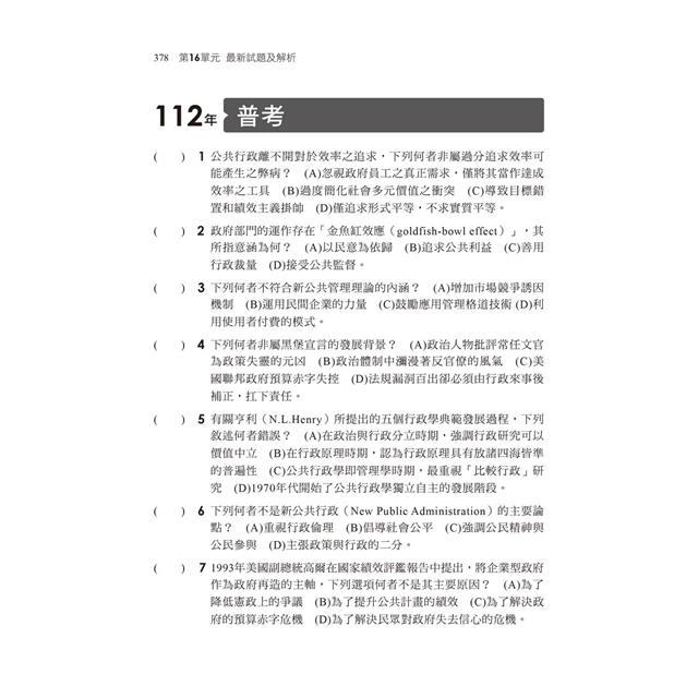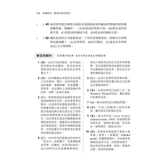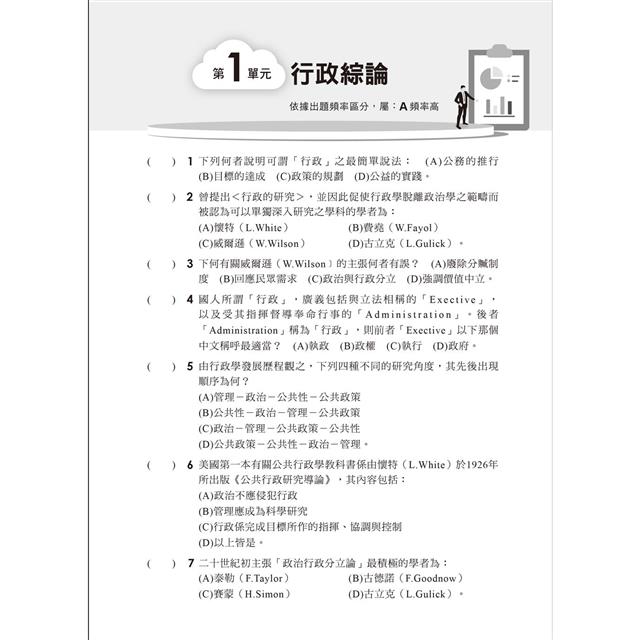 除了將歷年試題統整編入題庫內容,本書亦收錄了最新地特、高普等試題。綜觀歷屆考題,仍不離「80/20法則」,即80%題目仍是出自20%重點。因此,80%為考古題、14%為新題型、6%屬較艱深或課外的題目。本書題庫內容完整,搭配時效最新的近年試題,把握行政學重點的同時,可以鑑往知來、掌握命題方向,相信必能應付各種題型的題目,榮登金榜!