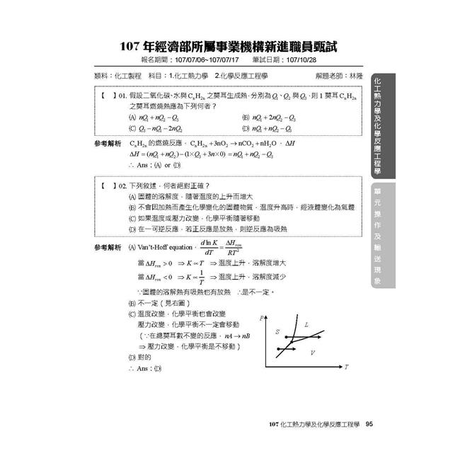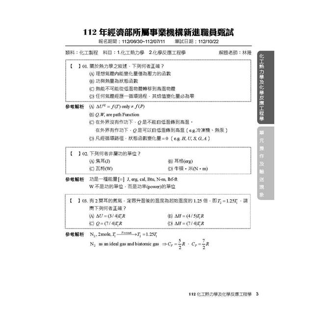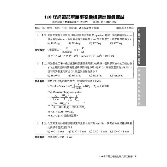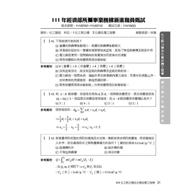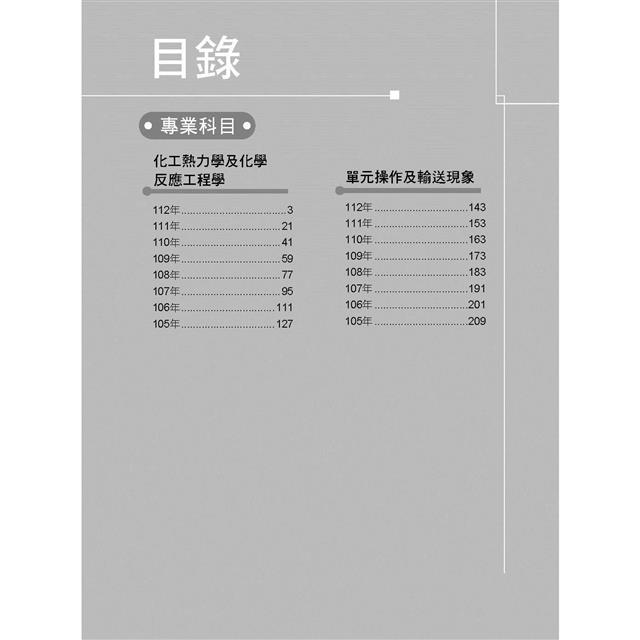 本書收錄科目包含:化工熱力學及化學反應工程學、單元操作及輸送現象